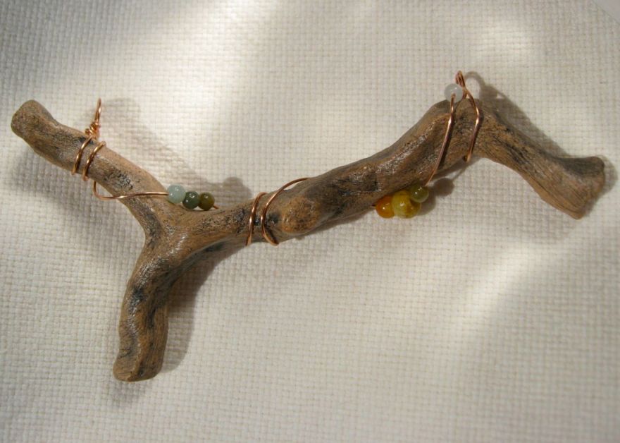 Well, this is what I did on Wednesday with some copper wire and a collection of delicate jadeite beads purchased when I lived in Beijing over a decade ago. I was trying to create the image of nature’s cycle – of an old leaf or twig wrapped in a copper ‘tendril’ that was wet with delicate beads of morning dew.