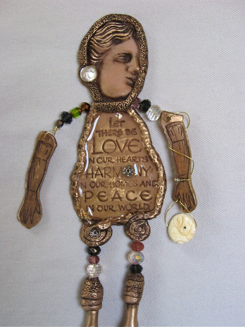 I found this out first hand at an Introduction to Polymer Clay workshop by the very gracious Maria herself, whose intriguing artwork reference shrines, amulets and talismans from her Greek Orthodox childhood. The class was held at Monkey Puzzle Workshop – a cosy, new art-discovery space at Eastsound Square launched by the inimitably bedecked Ms. Sallie Bell, as an extension of her stone bead and metal jewelry shop, Monkey Puzzle, a few doors down. In fact Sallie joined the class and together with Charlotte Sumrall, a textile artist, we three had a great time watching Maria’s demos, and getting our hands dirty with rolling and cutting the polymer clay (a hand-cranked pasta maker is involved), stamping with ink, and even applying gold leaf. It is just the most agreeable and approachable medium! To my delight, the material fees included some bead shopping at Sallie’s shop for embellishments to add to our ‘masterpiece’.