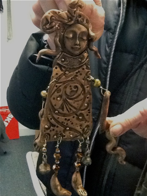 My first showing of work on Orcas Island! I exhibited two sets of ceramic jewelry in keeping with the show’s theme of Wearable Art. I was surprised to find myself the only artist to show jewelry (not a bad thing on hindsight), which serendipitously complemented the sumptuously handmade, hand beaded cloaks, costumes, fabric, masks and puppets on display. The costume works of Judy Tepley was astounding in their detail and intricacy, and I felt humbled thinking of the effort I spent in the mere bits of beading and threading I incorporated in my set of ceramic pendants above.