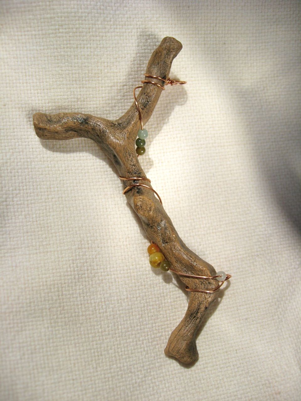 Well, this is what I did on Wednesday with some copper wire and a collection of delicate jadeite beads purchased when I lived in Beijing over a decade ago. I was trying to create the image of nature’s cycle – of an old leaf or twig wrapped in a copper ‘tendril’ that was wet with delicate beads of morning dew.