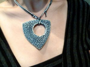 On Orcas, where the pacific Northwest summer breeze is more unpredictable, I strung the last pendant in this style on a necklace that I had made using curly knitting wool that I had woven like a ‘friendship band’ in some sections, and it changed the look of the pendant immediately. It can be worn lower on the front, over turtlenecks and sweaters, almost like a long, loose scarf, warm and fuzzy around the neck. Neat. Now I have a versatile accessory that adapts to the seasons. It would be fun to wrap around the waist as a belt buckle too. To think it started life as a napkin ring.