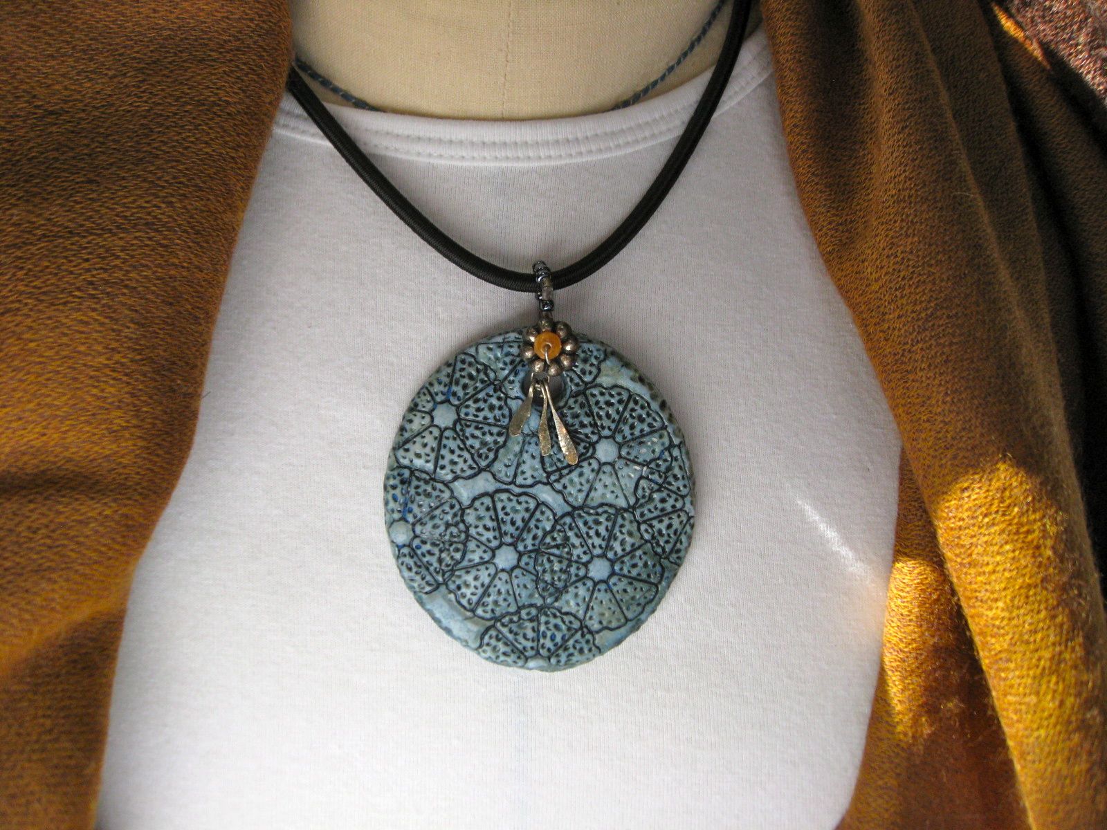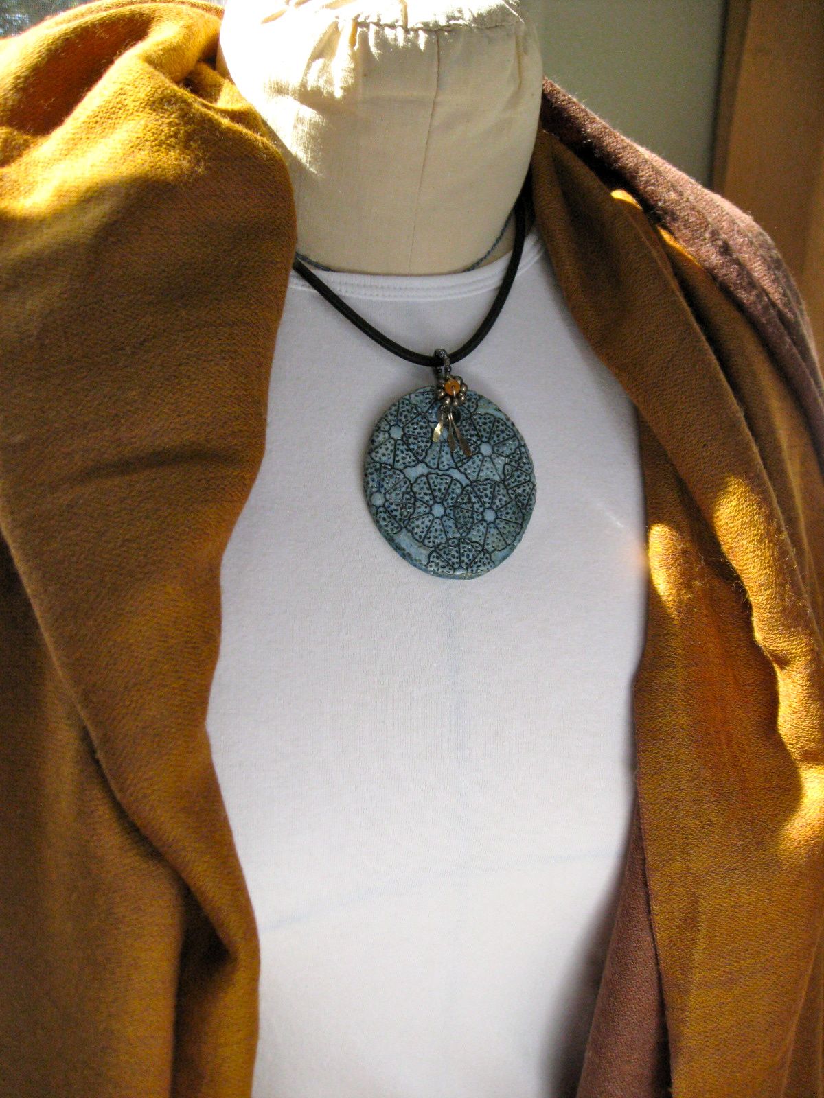 “Citrus Demin” Hand stamped ceramic pendant, oxide rub, celadon and clear glazes; found beads and custom made black cord with stainless steel clasp