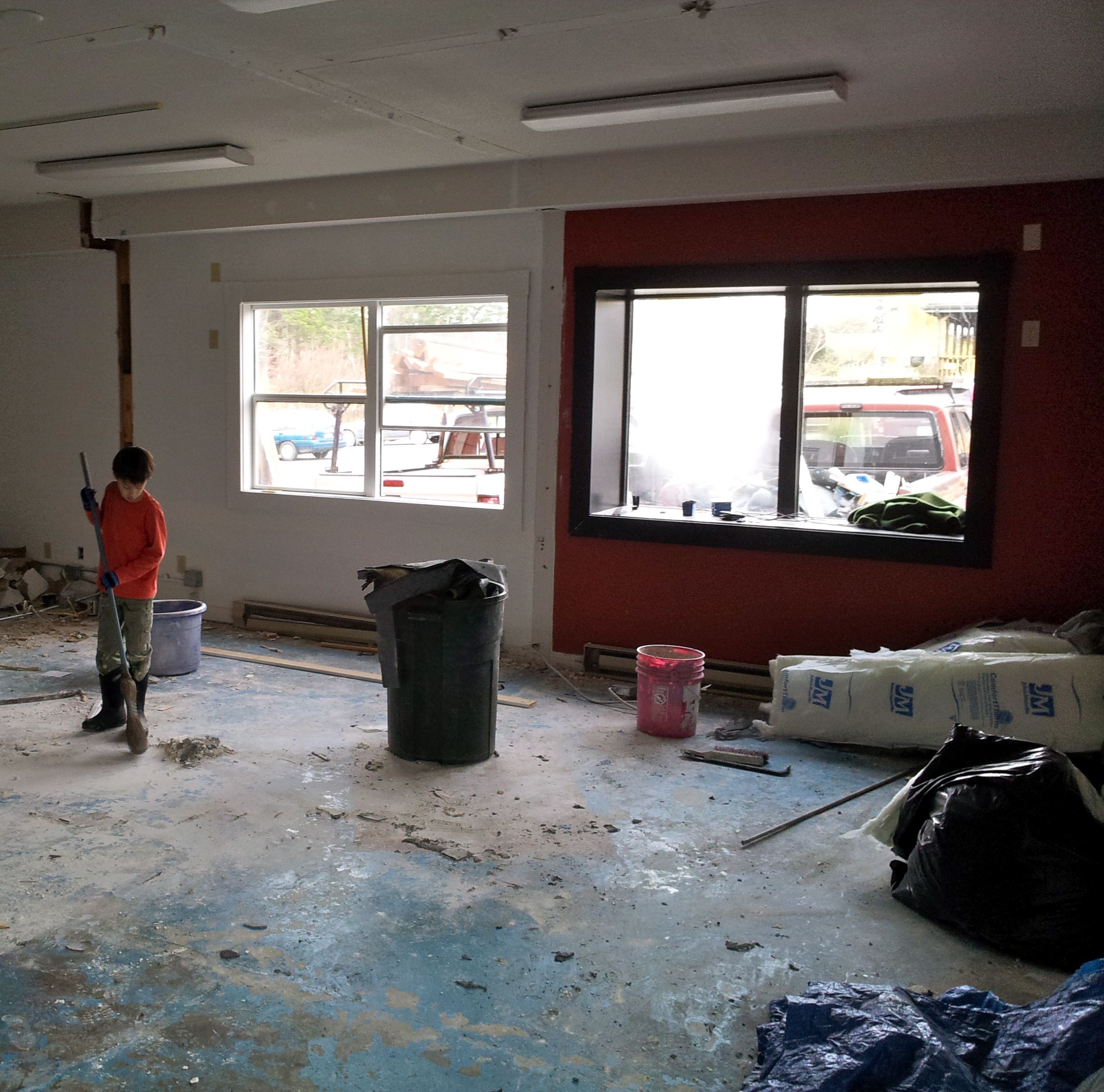 Before: a divided office spaceWalls and carpet removedAfter: Concrete floor and white surfaces. Yay! Now: recent work in the front room gallery
