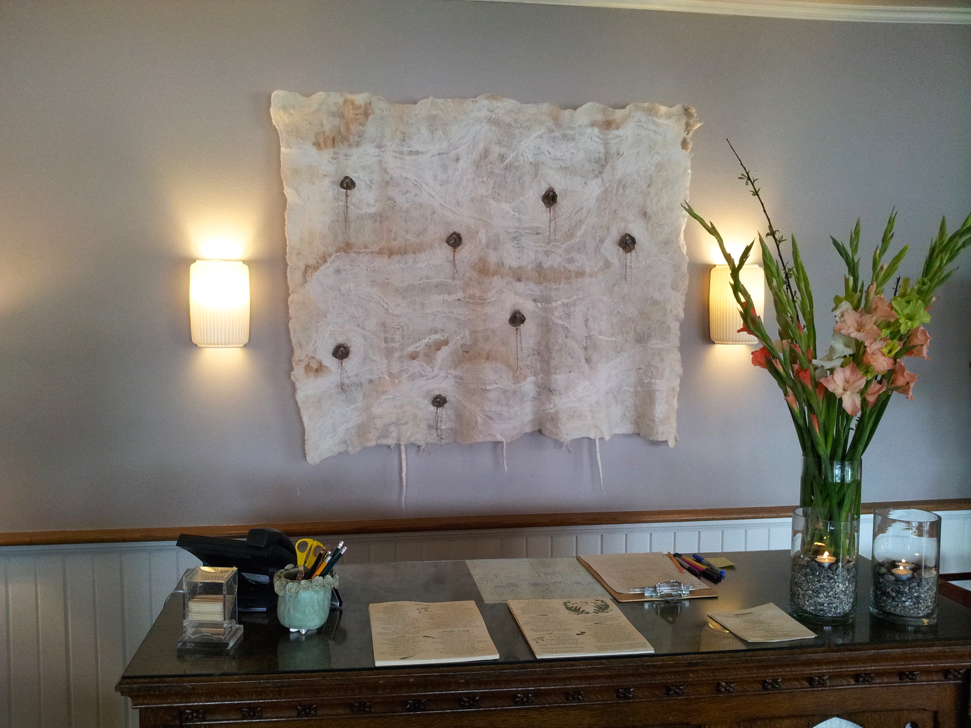 And, very special thanks goes out to Outlook Inn on Orcas Island for featuring our very large mixed media wall piece, Collaboration I, by Christa Smith and I, in their restaurant, New Leaf Cafe – the must-do dining spot on my Orcas list for visiting family and friends. Heading out for a walk in the spring sun now, see you on the shore!